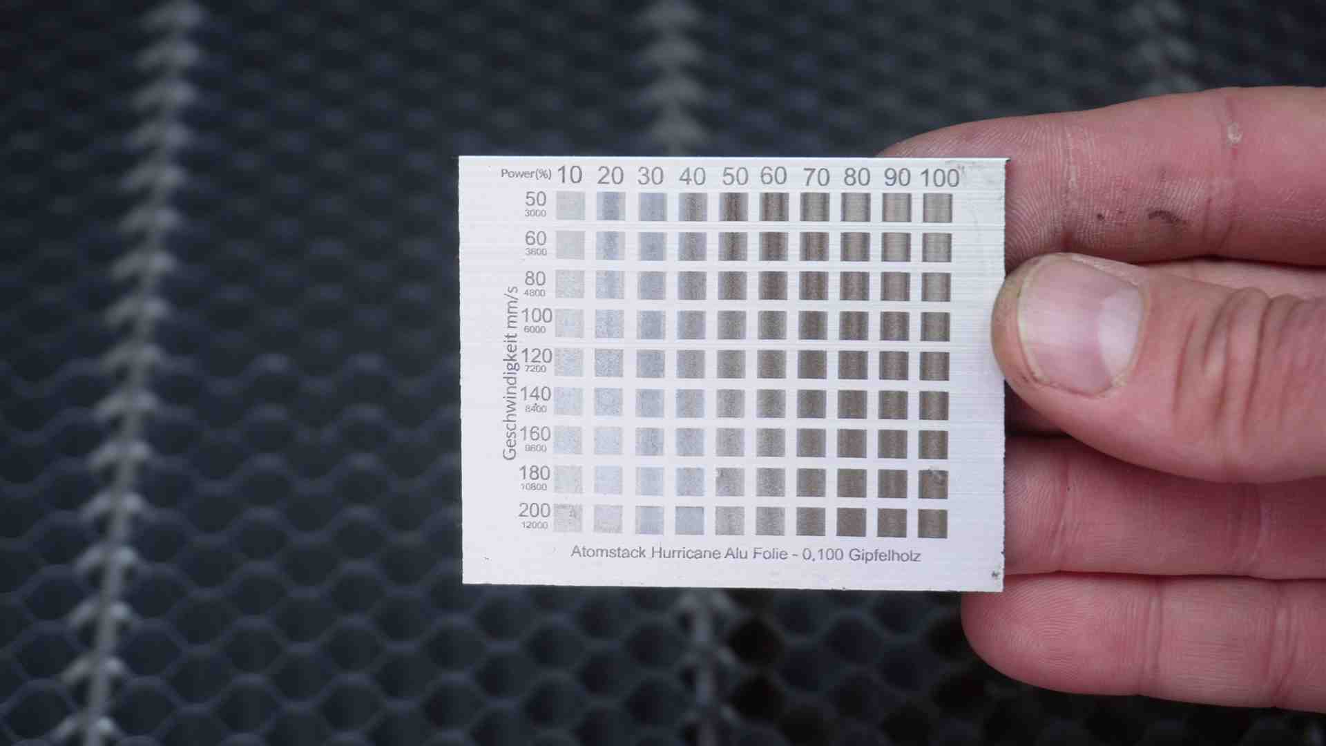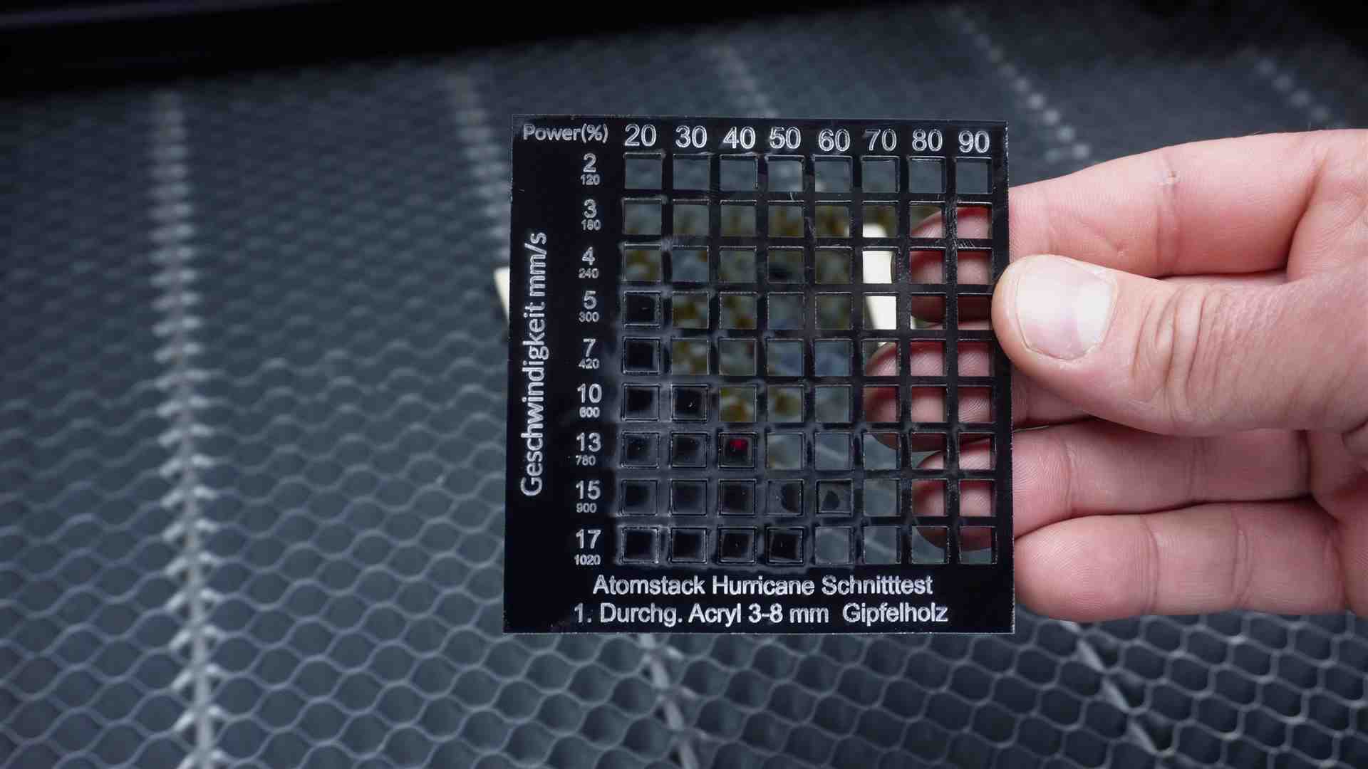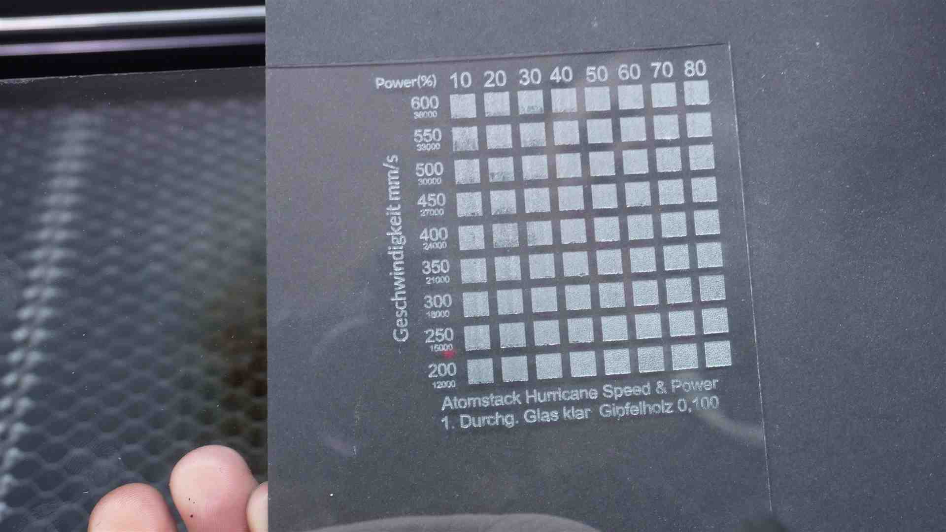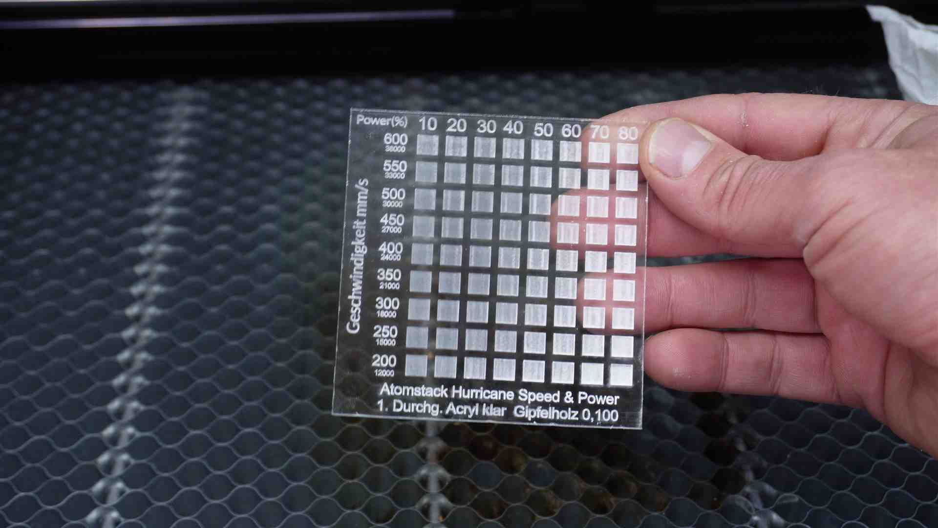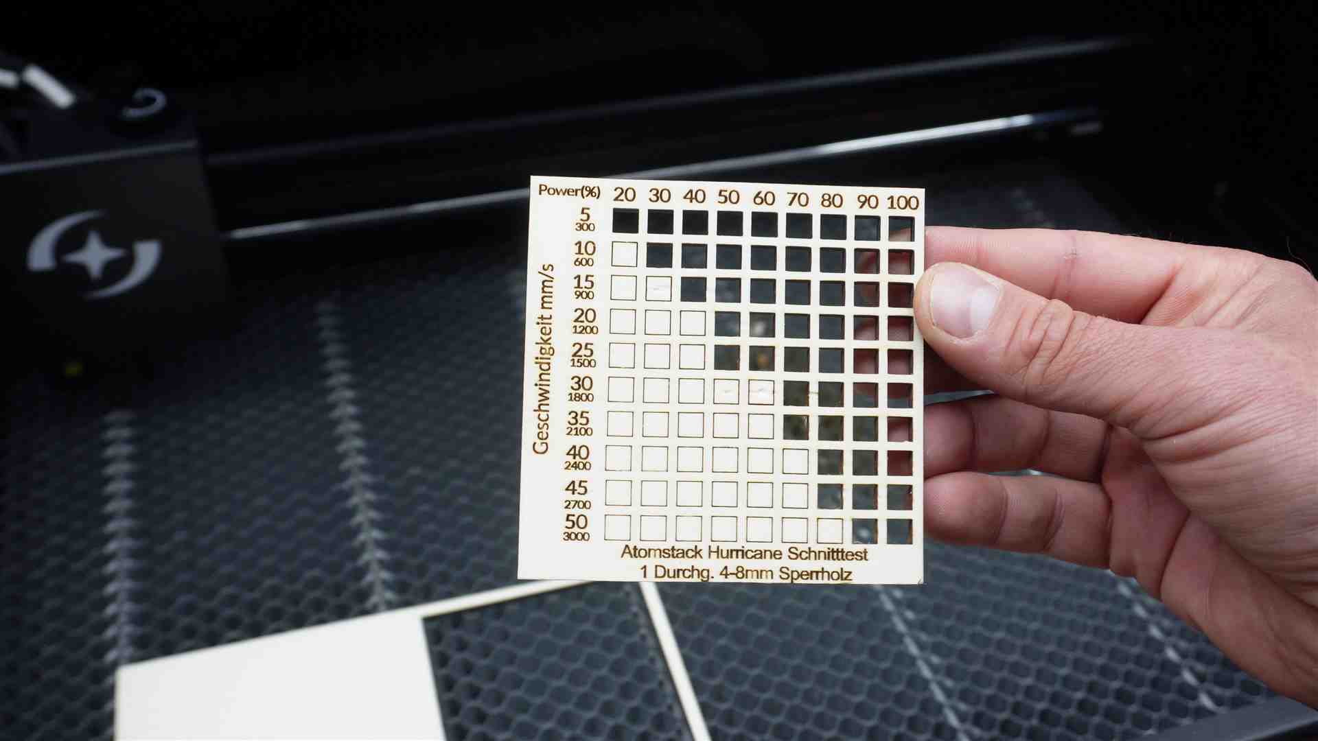 Lasern mit dem AtomStack Hurricane 55W CO2 Laser. Hier einige Beispiele mit Werten aus dem Video