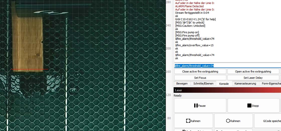 Ich empfehle Euch aber den Standardwert eingestellt zu lassen – der wurde von Atomstack so angepasst, dass die Maschine bei Feuer keinen Schaden nimmt und nicht zu früh ausgelöst wird. Natürlich kann das je nach Material unterschiedlich sein.