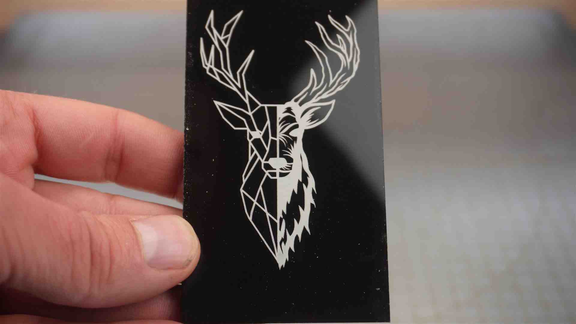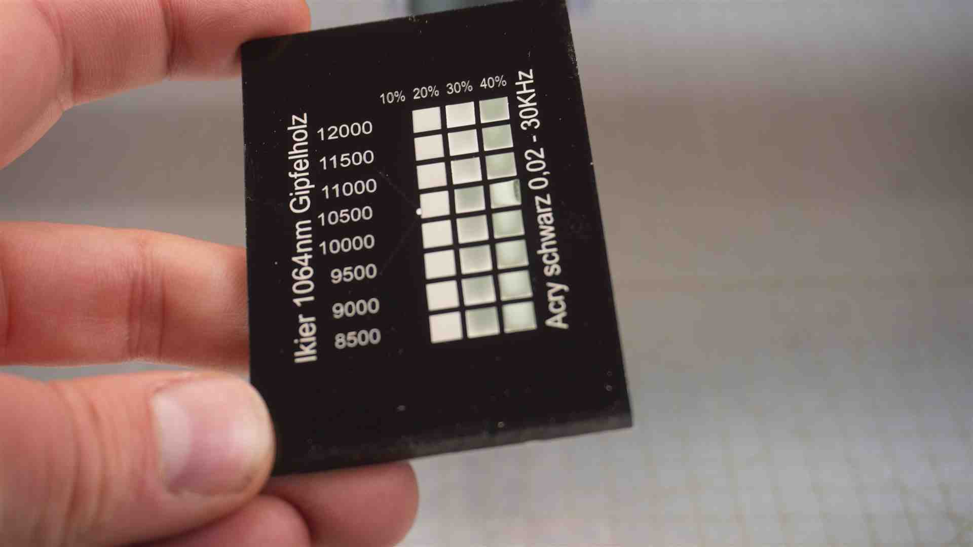 – Acryl schwarz Gravur 1000 mm/min / 20 % Power – Zeilenintervall 0,02 – 30KHz