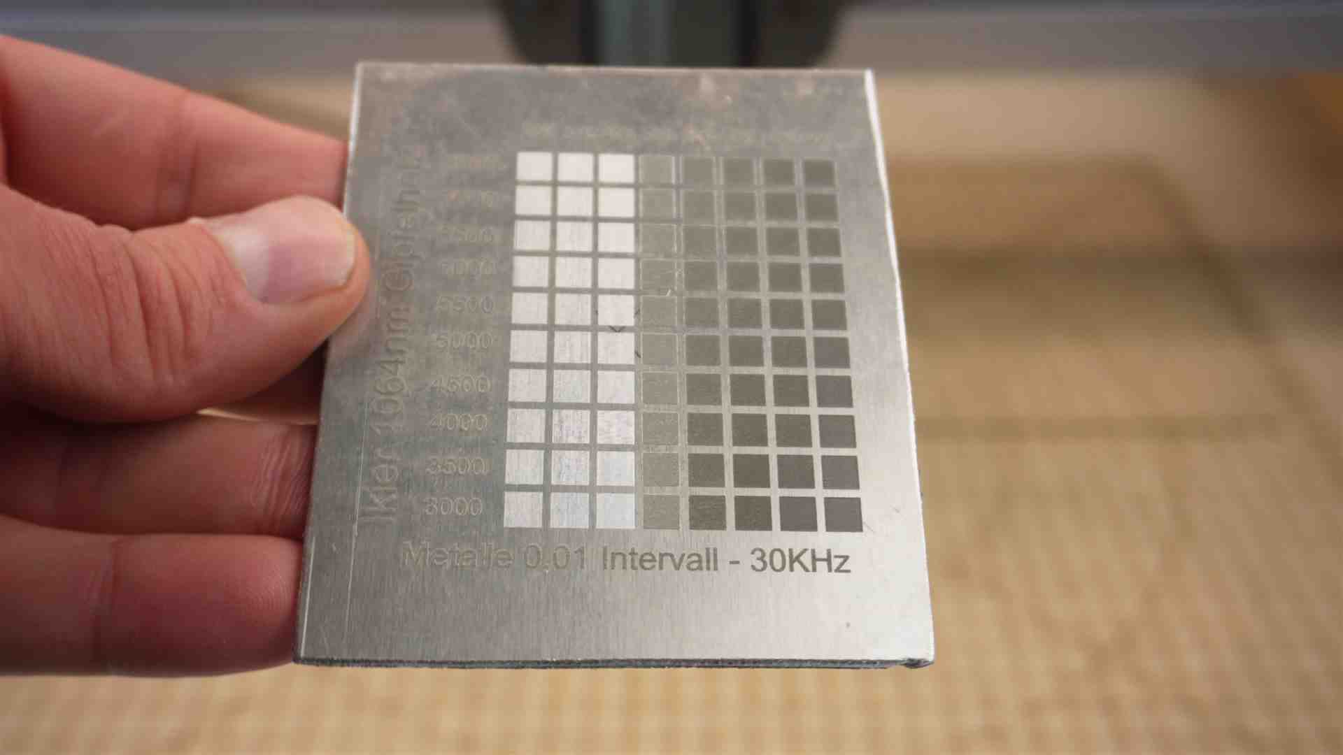 – Edelstahl Gravur – hell 6500 mm/min / 30 % Power – Zeilenintervall 0,03 – 60KHz