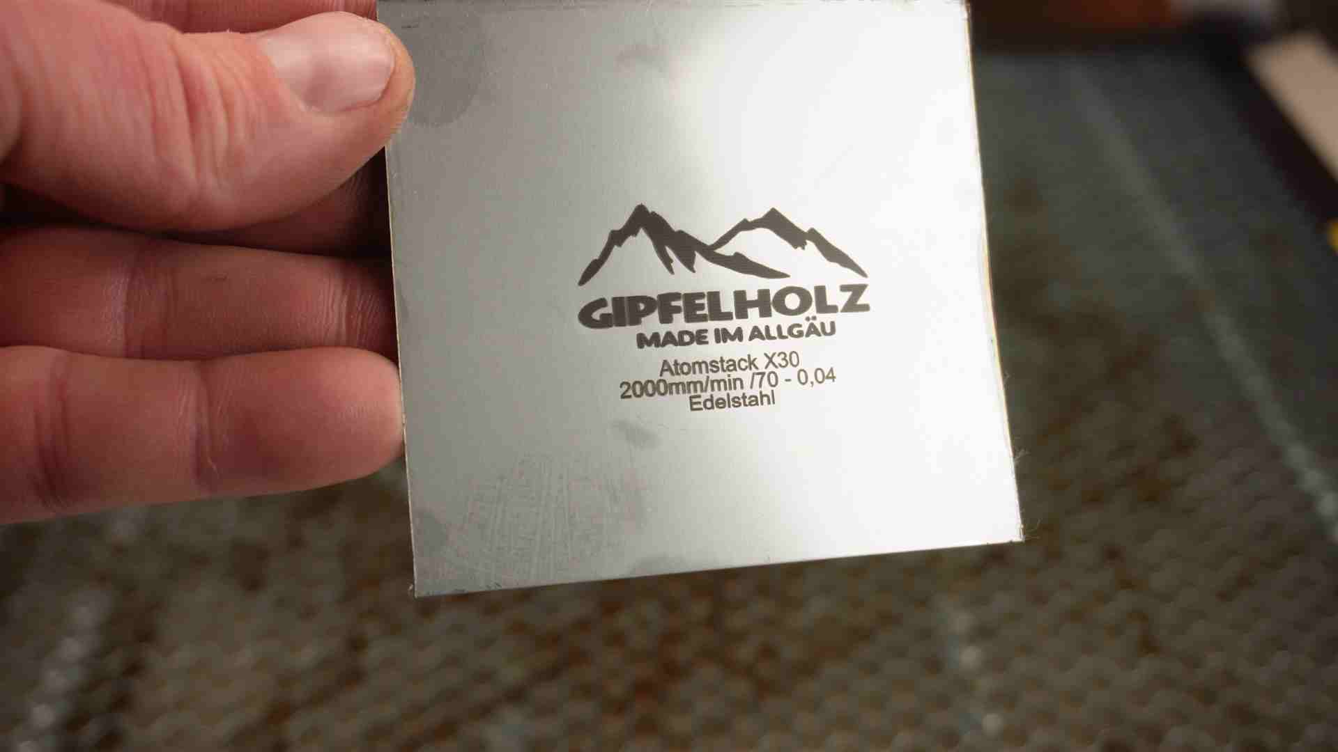 – Logo auf Edelstahl: 1800 mm/min / 70 % Power 0,04 Zeilenintervall