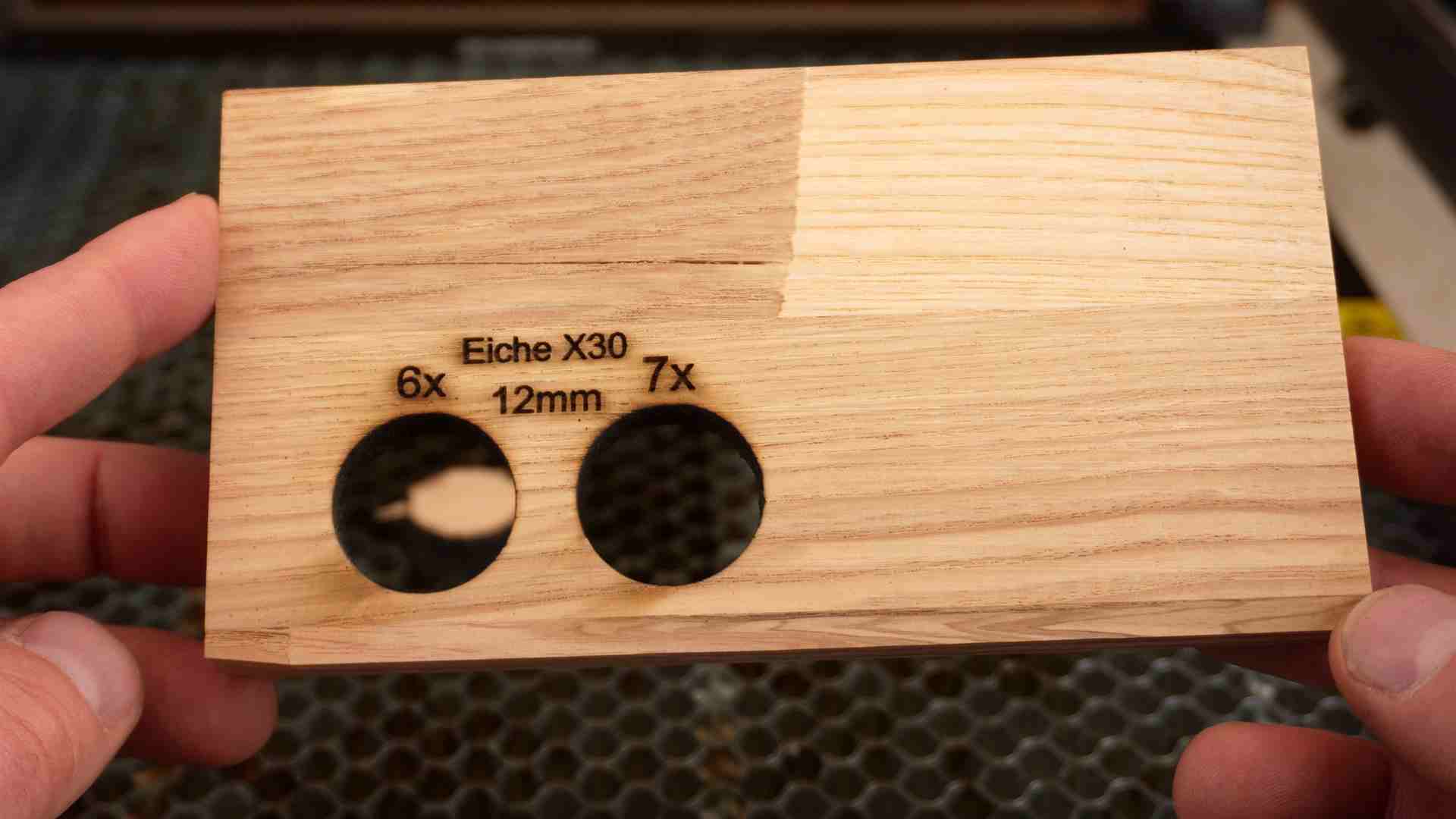 – Eiche 12mm: 200 mm/min / 90 % Power – 6-7 Durchgänge (X20 war nicht möglich)