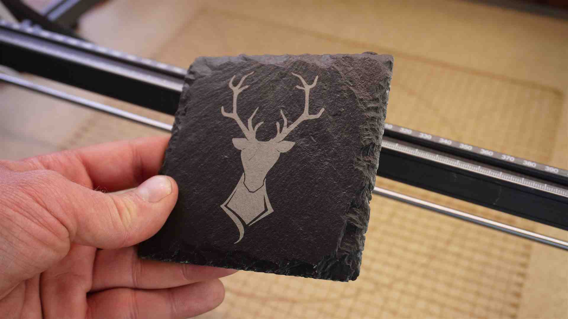 Schiefer ist sehr einfach zu gravieren. Vorher habe ich den Schiefer mit einer Schicht matten Lack beschichtet. Wunschmotiv einfach lasern, danach noch mit einer Schicht mattem Lack überzogen.