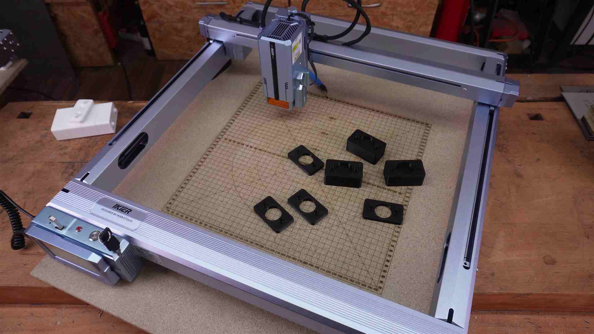 Wie bei jedem Laser habe den Rahmen auf eine Opferplatte gestellt. Dazu habe ich mir eine 3D Druck Datei erstellt um die runden Füße im an der gleichen Stelle auf der Opferplatte zu haben.