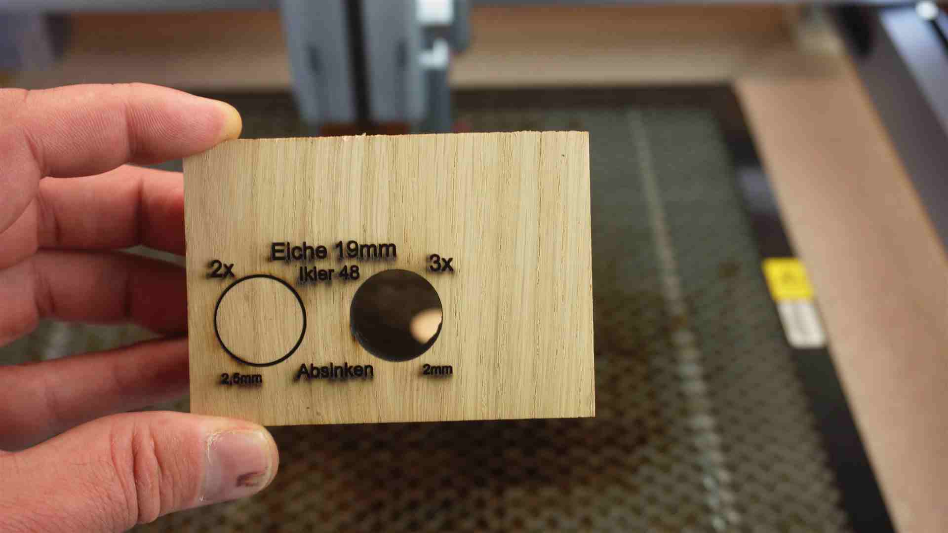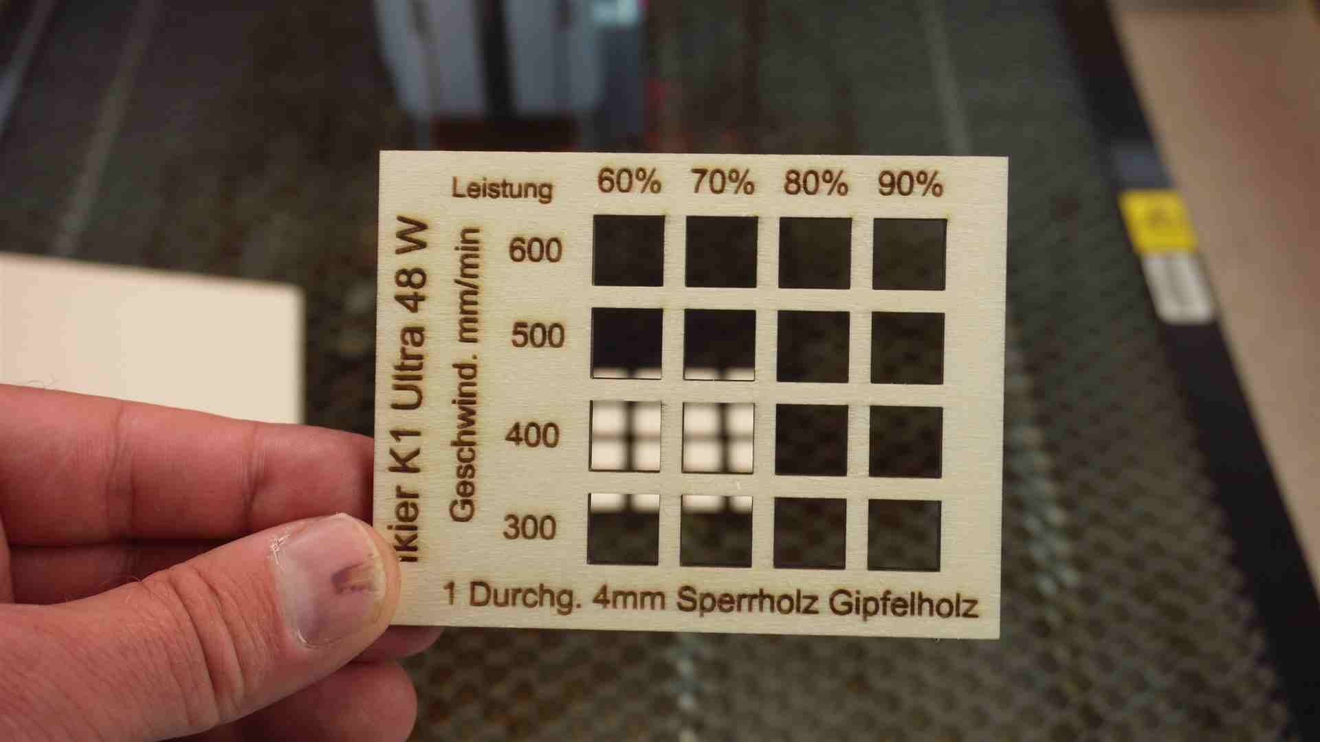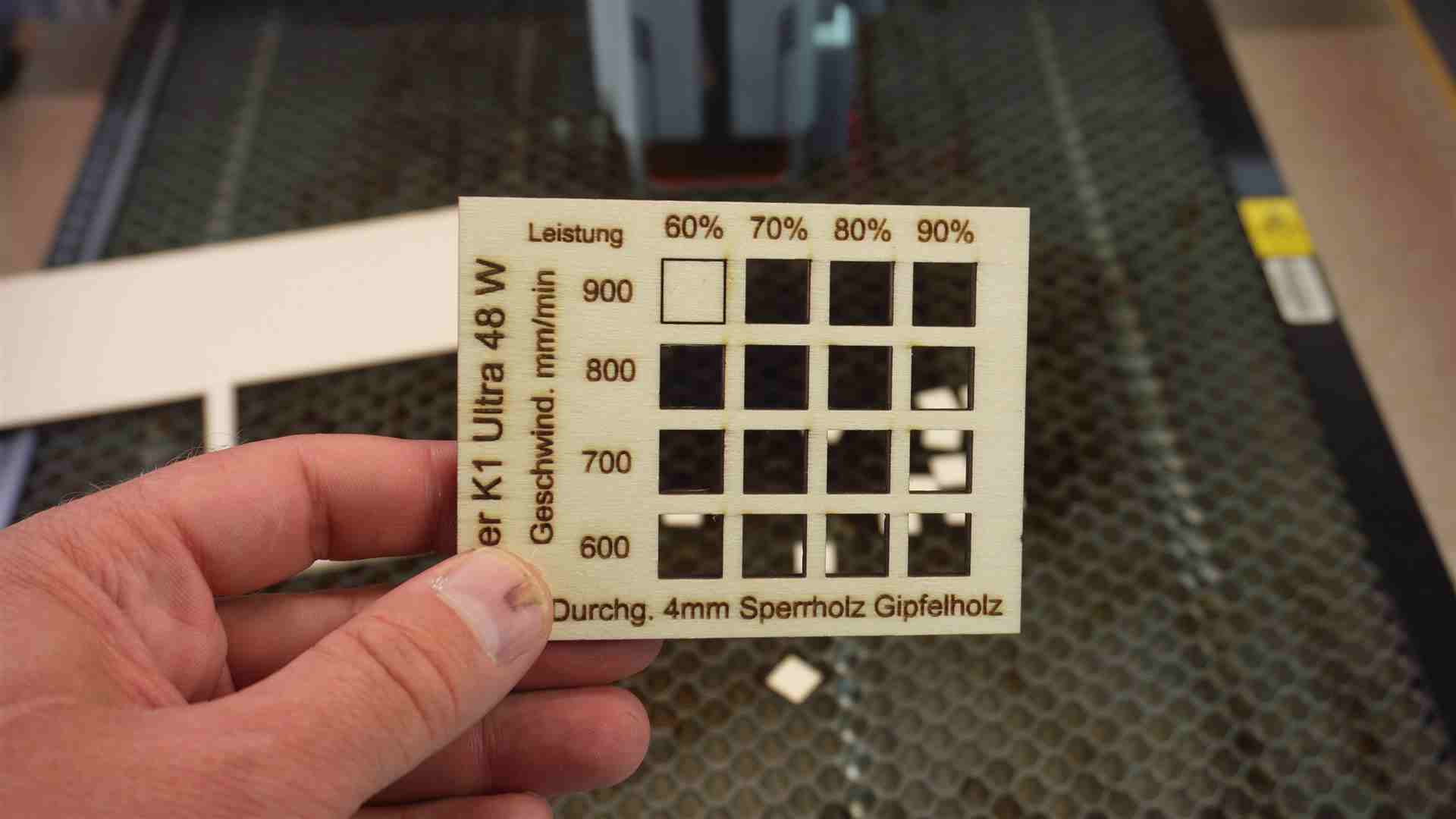 Alle Werte sind ca. Angaben und können je nach Holz – Qualität und Material abweichen. Mit diesen Werten habe ich gute Ergebnisse bekommen. Allerdings können die Werte auch angepasst werden um auf das gleiche Ergebnis zu kommen. Viele Materialien lassen sich auch mit einer höheren Geschwindigkeit lasern, dazu muss auch die Leistung erhöht werden.