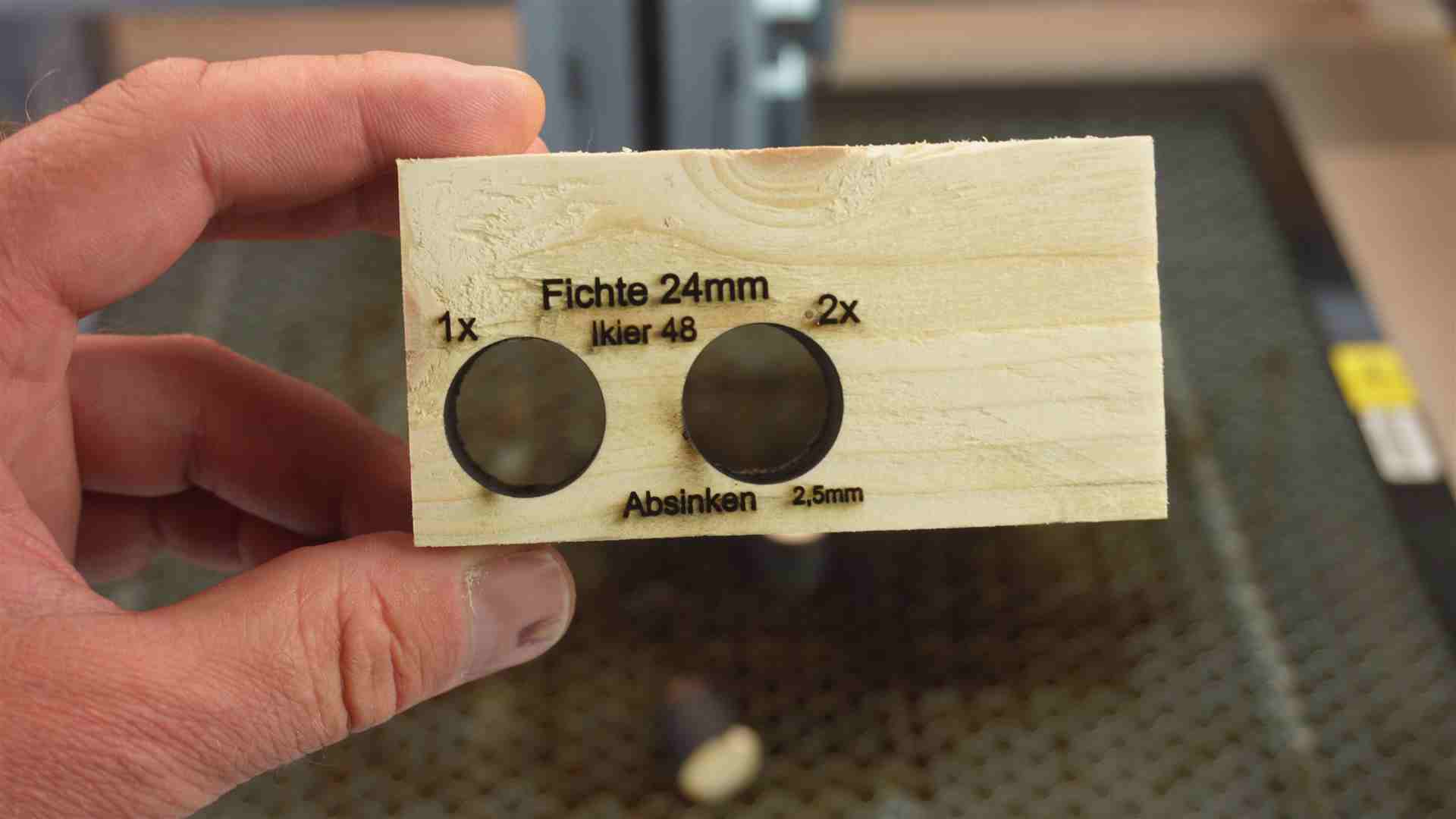 – Fichte 24mm: 200 mm/min / 90 % Power – 1 Durchgang ohne Absenken / 2 Durchgänge mit autom. Absenken 2mm –   (Ikier Ultra: 200 mm/min / 90 % Power – 4 Durchgänge)