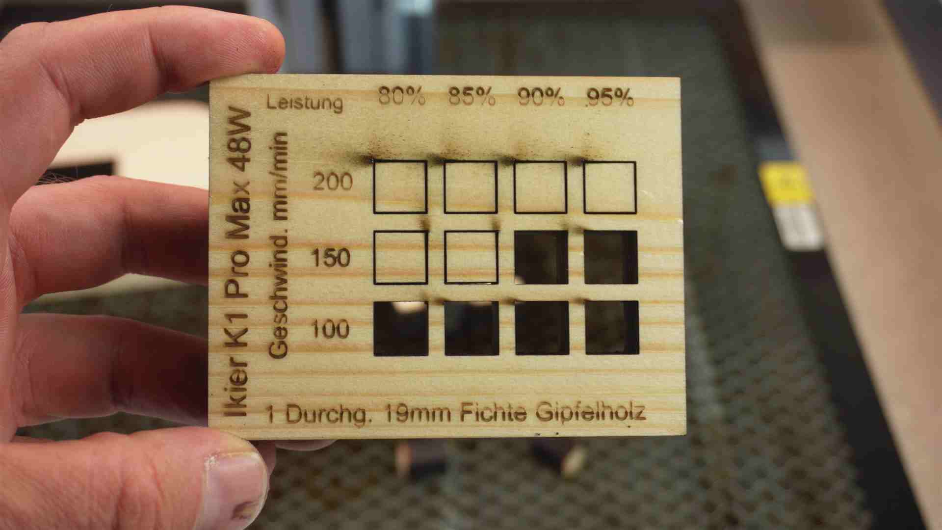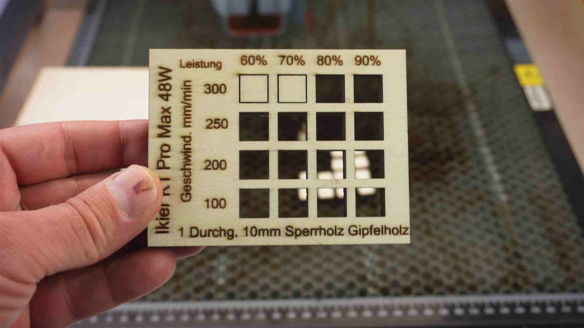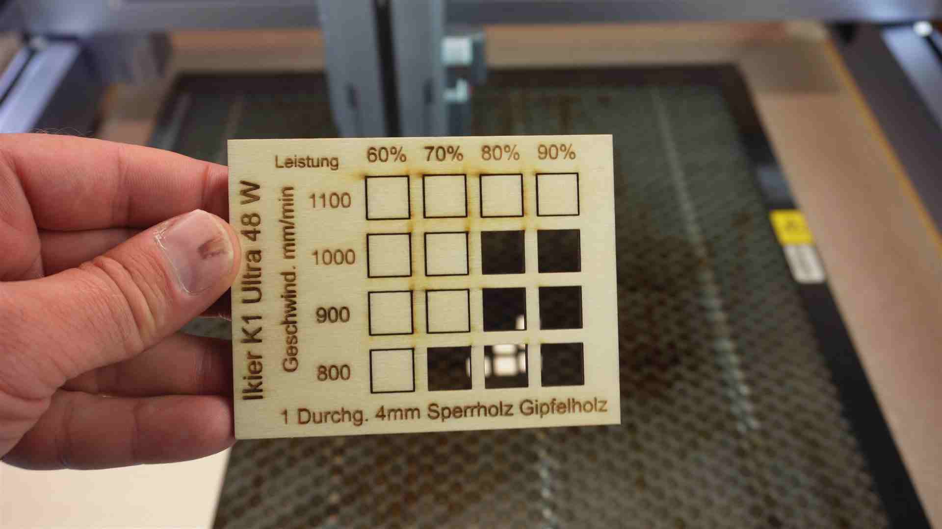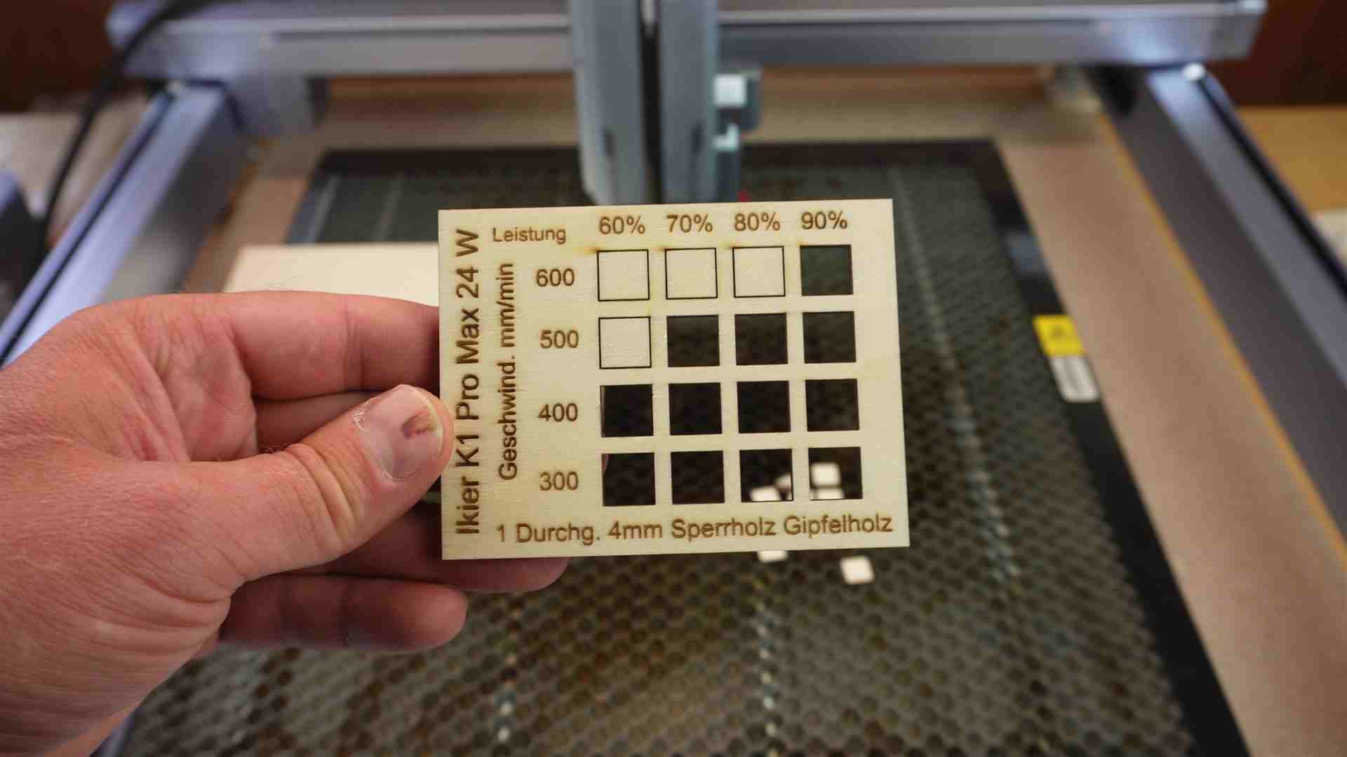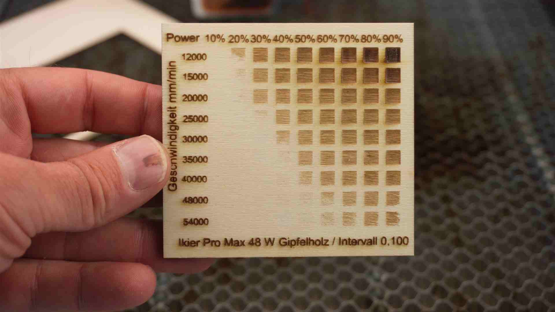 Achtung die angegebenen Werte gelten für den Ikier K1 Pro Max 48/24 Watt. Solltet Ihr Euch mit Eurem Laser unsicher von den Werten sein, empfehle ich Euch immer einen Speed und Powertest auf dem Wunschmaterial durchzuführen. Diesen könnt Ihr ebenso kostenlos Downloaden. Siehe weiter unten.
