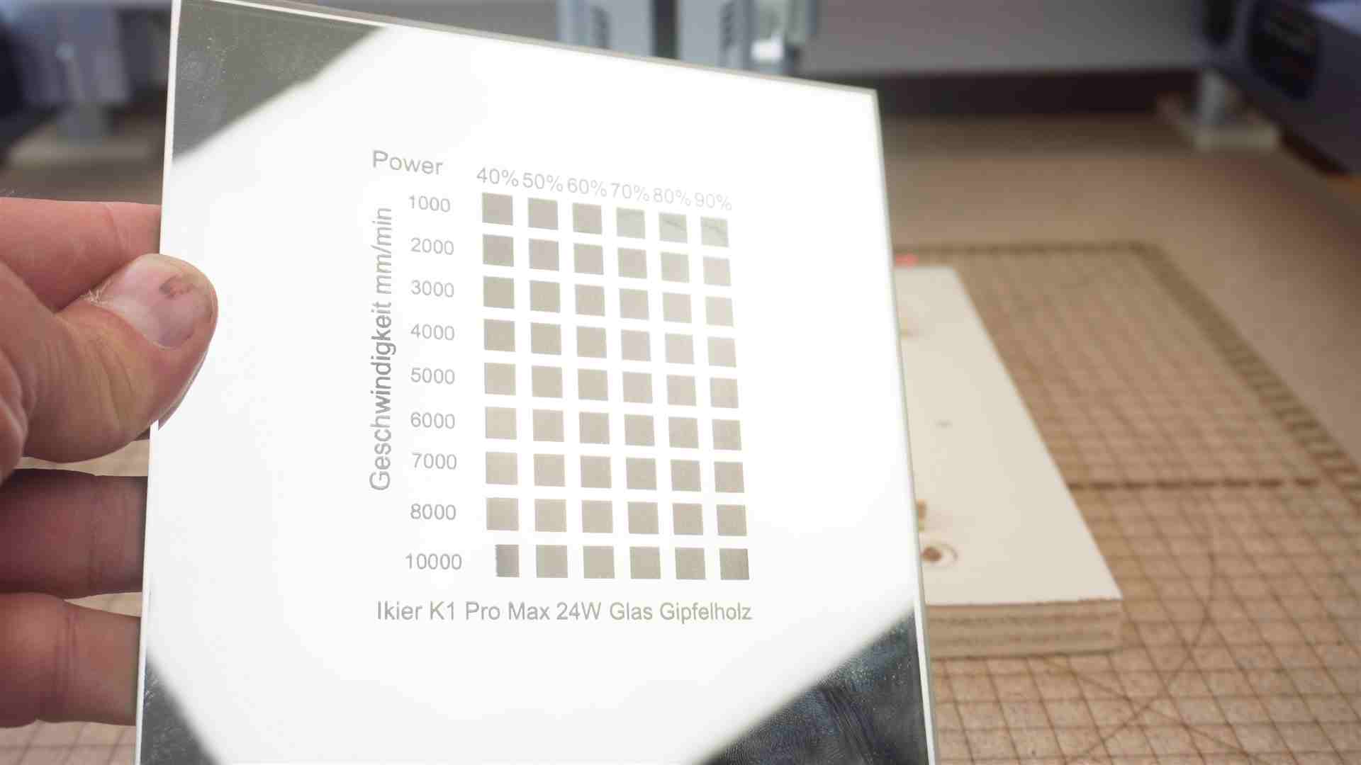 – 30000 mm/min / 60 % Power – Zeilenintervall 0,05 – 24 Watt (Ikier K1 Ultra 36 Watt: 40000 mm/min / 60 % Power – Zeilenintervall 0,05)