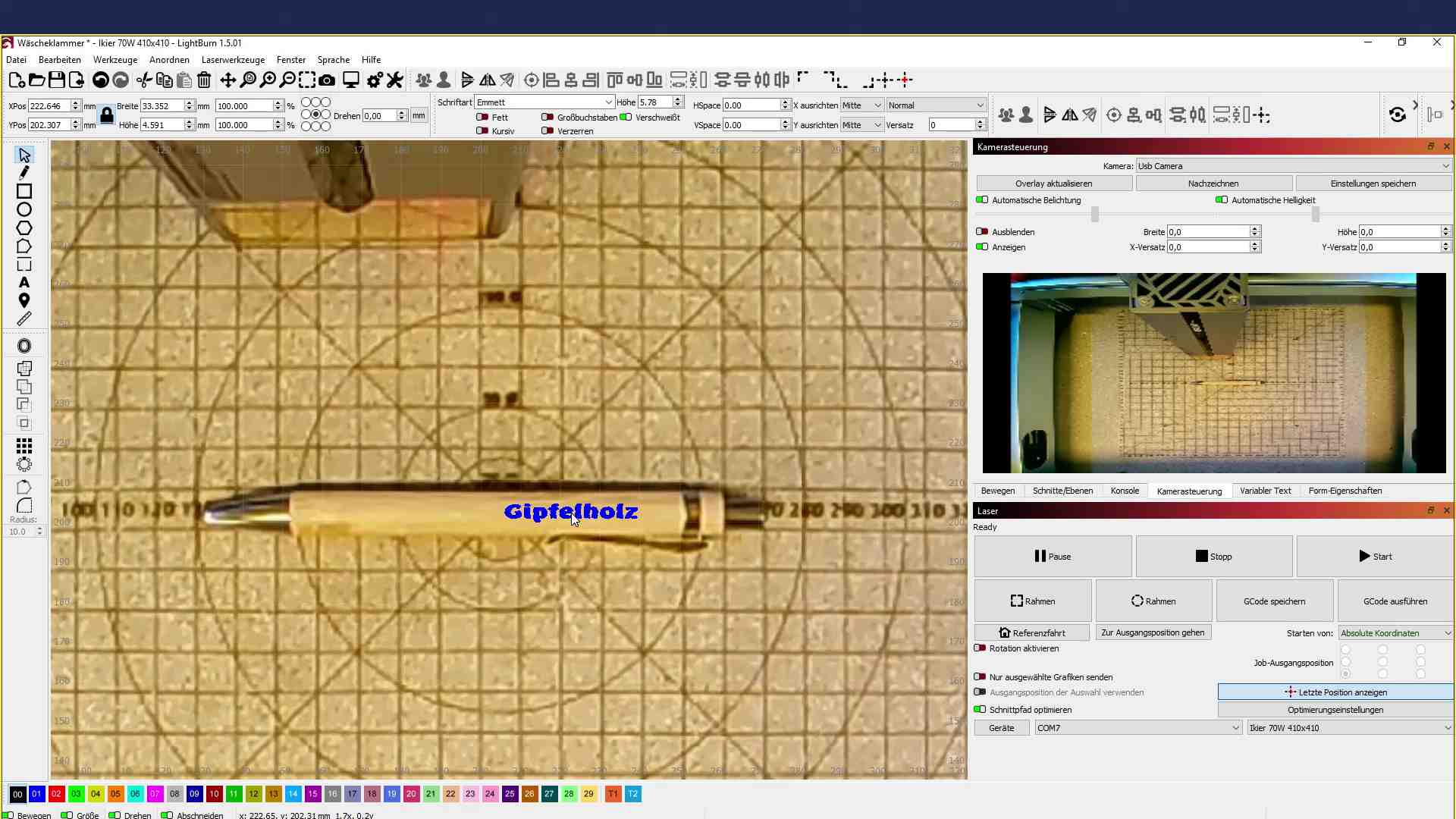 Somit kann man genau auf die Mitte des Kreuzes ausrichten, einen Button in Lightburn drücken und der Laser beginnt da, wo das Kreuz ausgerichtet wurde.