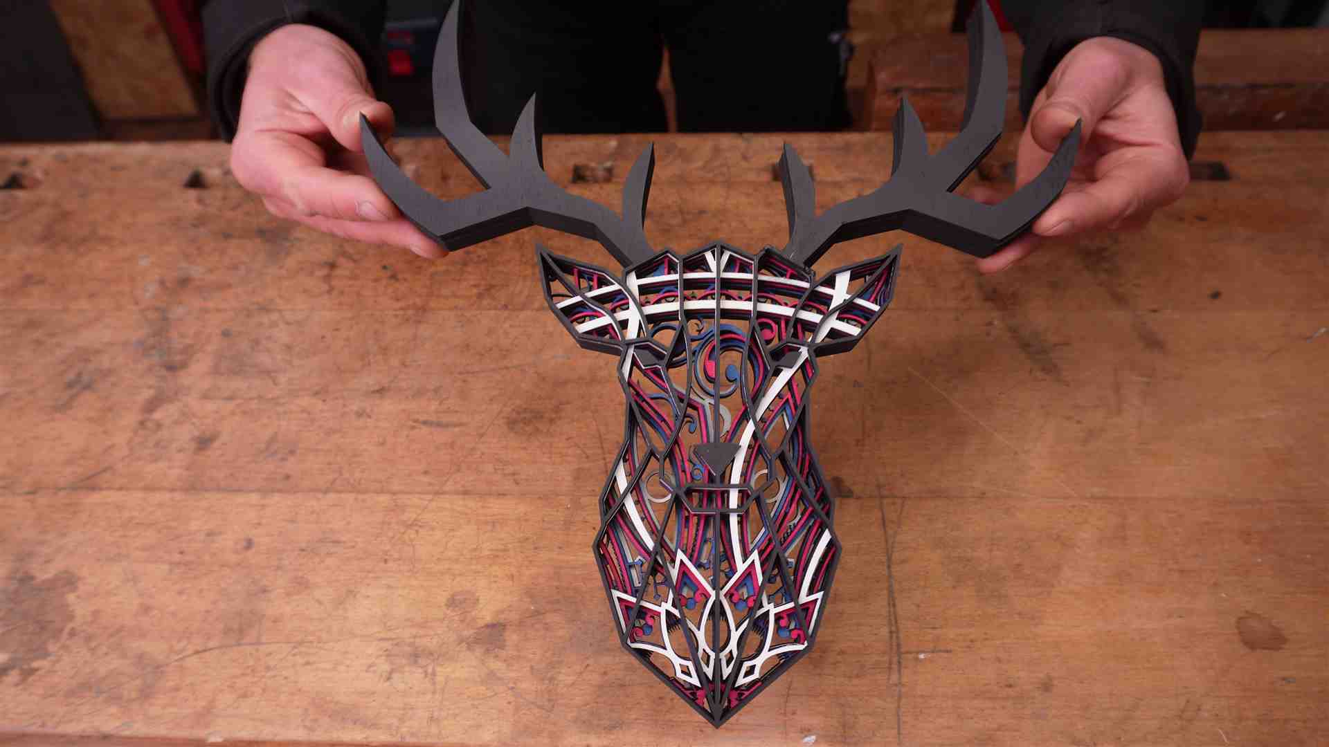 Verwendet habe ich hier 4mm Pappel Sperrholz. Ich empfehle aber dünneres Holz… in dem Fall des Hirsches, fehlen noch 3 weitere Layer. Dadurch würde das Bild mit 4mm Holz sehr dick werden. Deshalb ggf. 2mm Sperrholz nutzen.