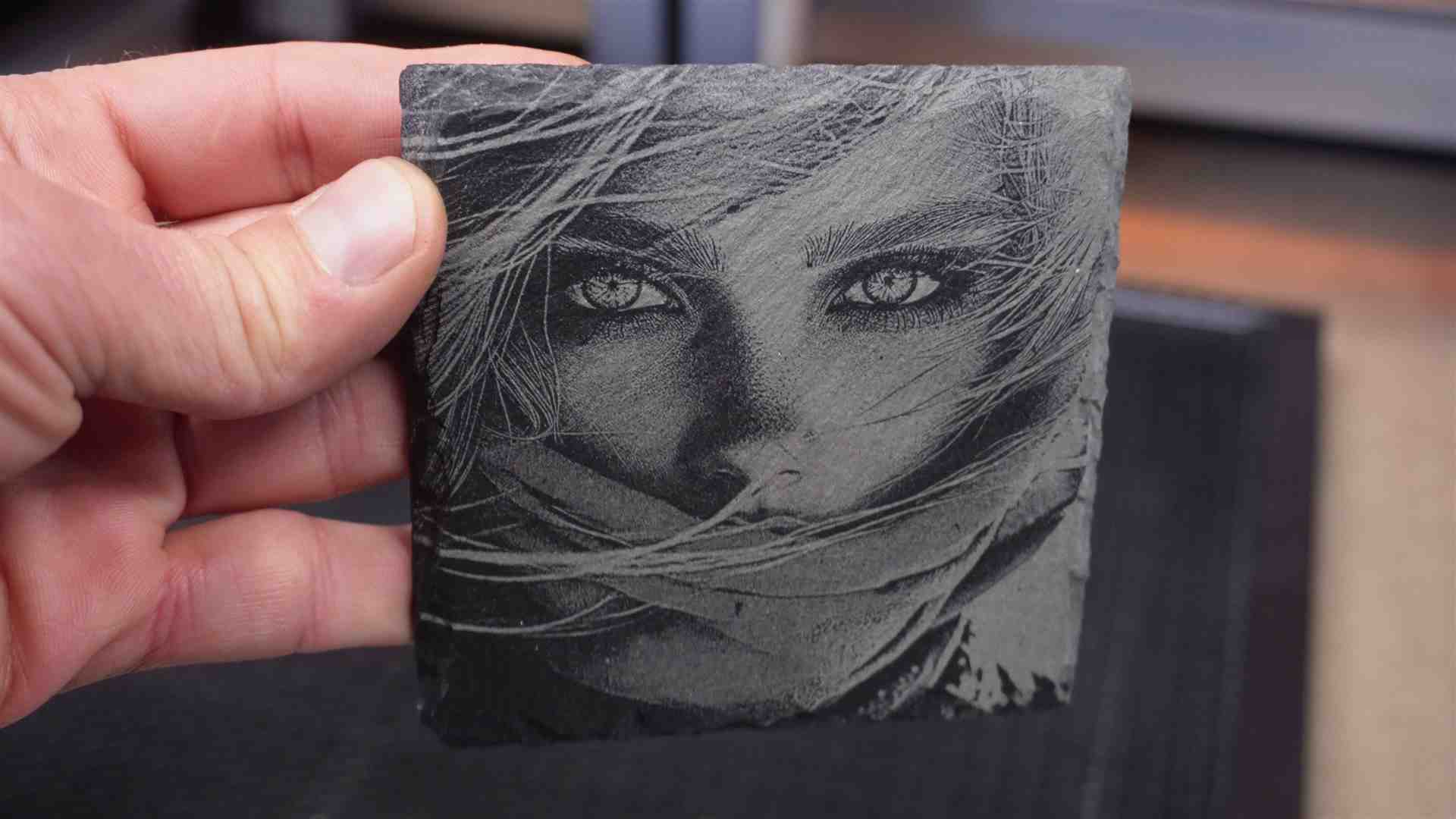 Schiefer ist wirklich sehr einfach zu gravieren. Vorher habe ich den Schiefer mit einer Schicht matten Lack beschichtet. Wunschmotiv lasern, danach noch mit einer Schicht mattem Lack überzogen.