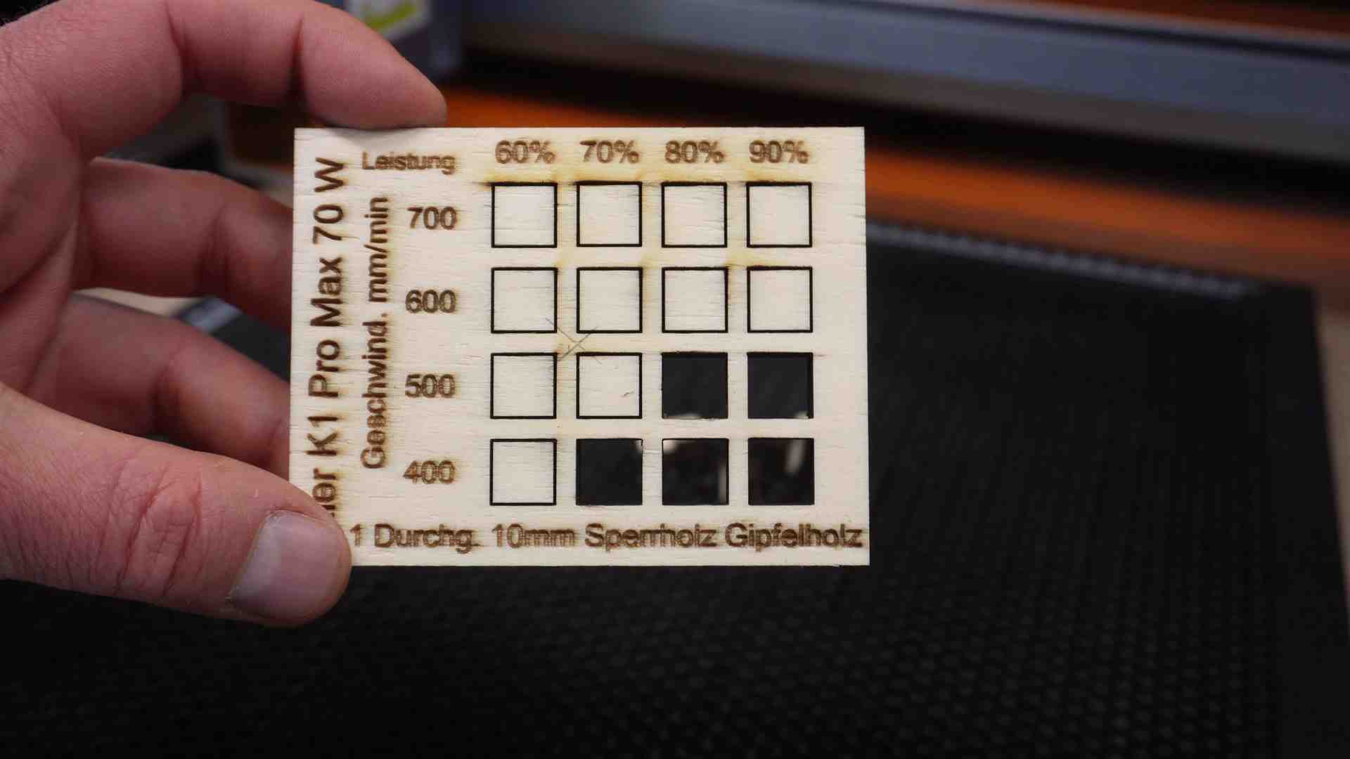 Alle Werte sind ca. Angaben und können je nach Holz – Qualität und Material abweichen. Mit diesen Werten habe ich gute Ergebnisse bekommen. Allerdings können die Werte auch angepasst werden um auf das gleiche Ergebnis zu kommen. Viele Materialien lassen sich auch mit einer höheren Geschwindigkeit lasern, dazu muss auch die Leistung erhöht werden.