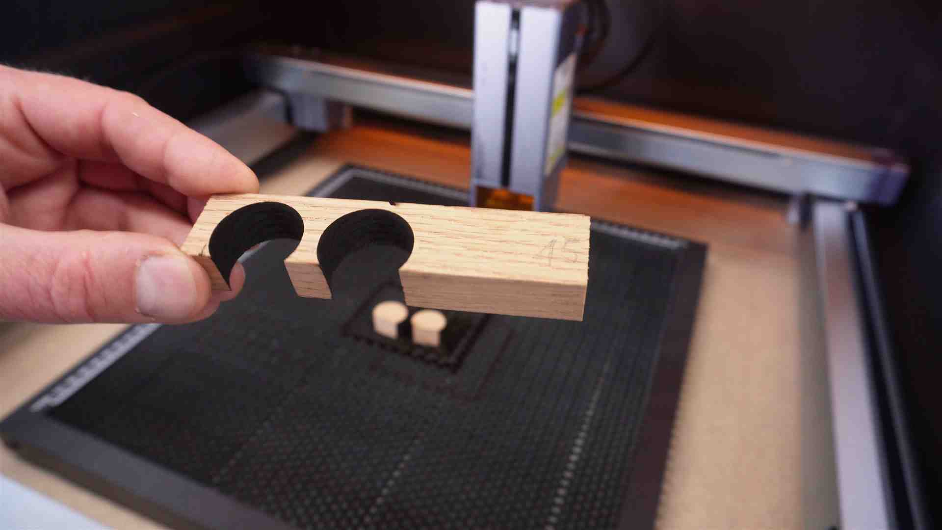 – Schnitttest 16mm Eiche 1 Durchgang – Speed 130 mm/min – 95% Power – 70 Watt