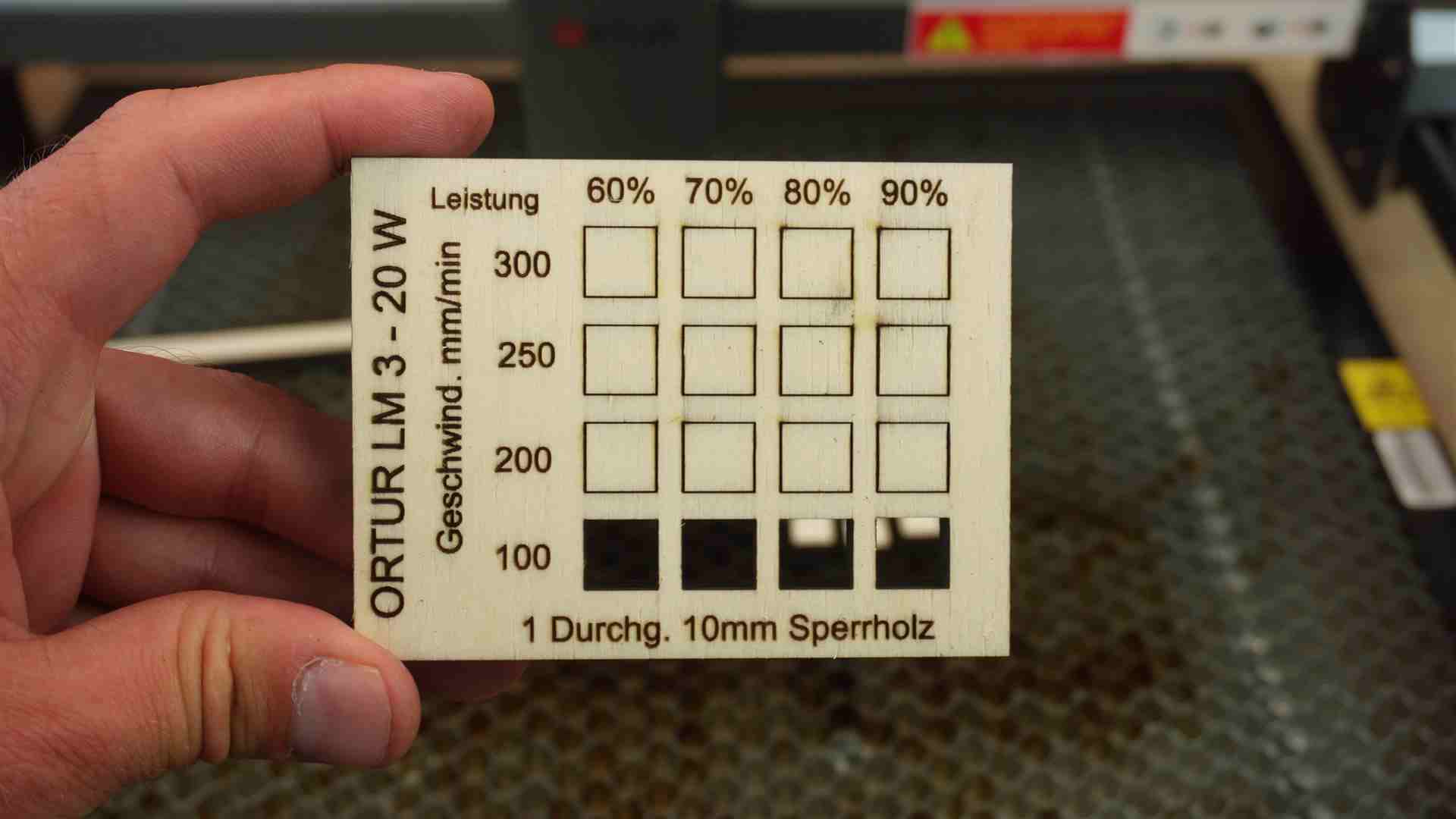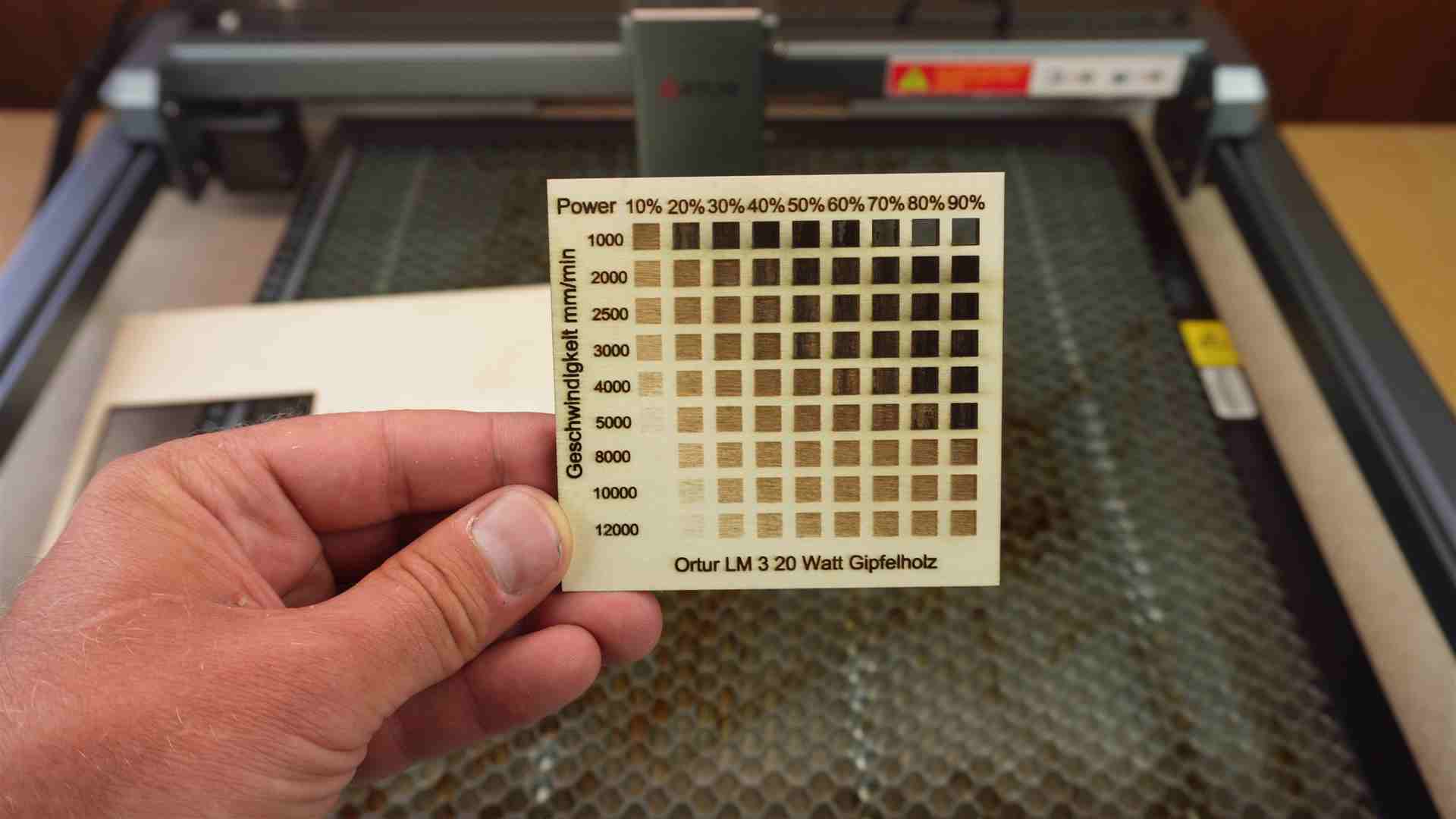 Achtung die angegebenen Werte gelten für den Ortur LM3 mit 20 Watt. Solltet Ihr Euch mit Eurem Laser unsicher von den Werten sein, empfehle ich Euch einen Speed und Powertest. Diesen könnt Ihr Euch kostenlos weiter unten Downloaden. Alle Sachen zum Lasern habe ich mit verlinkt.