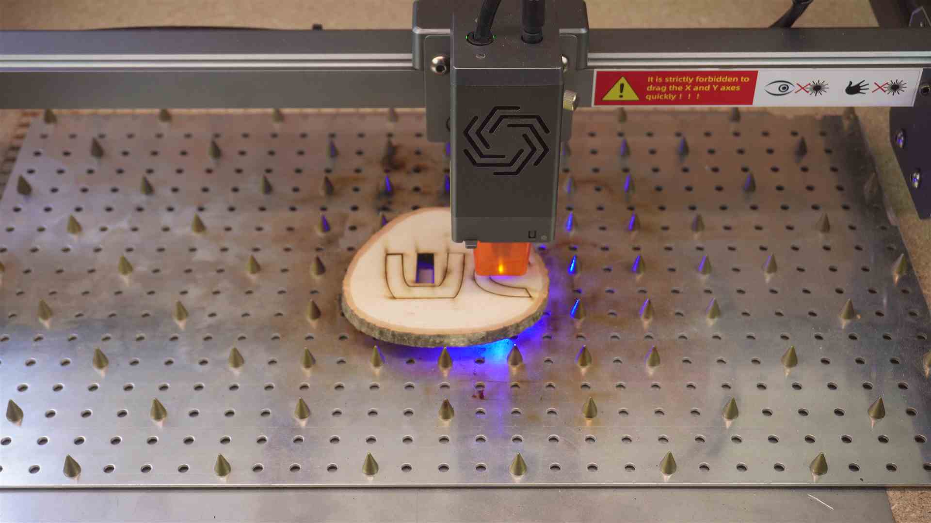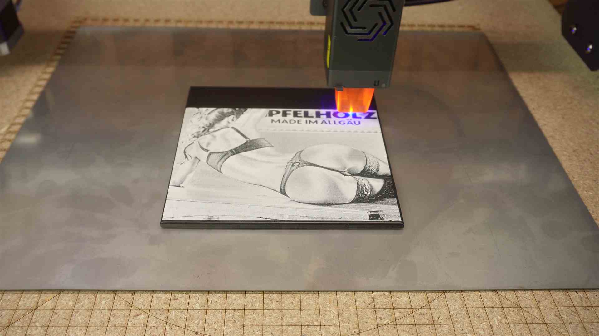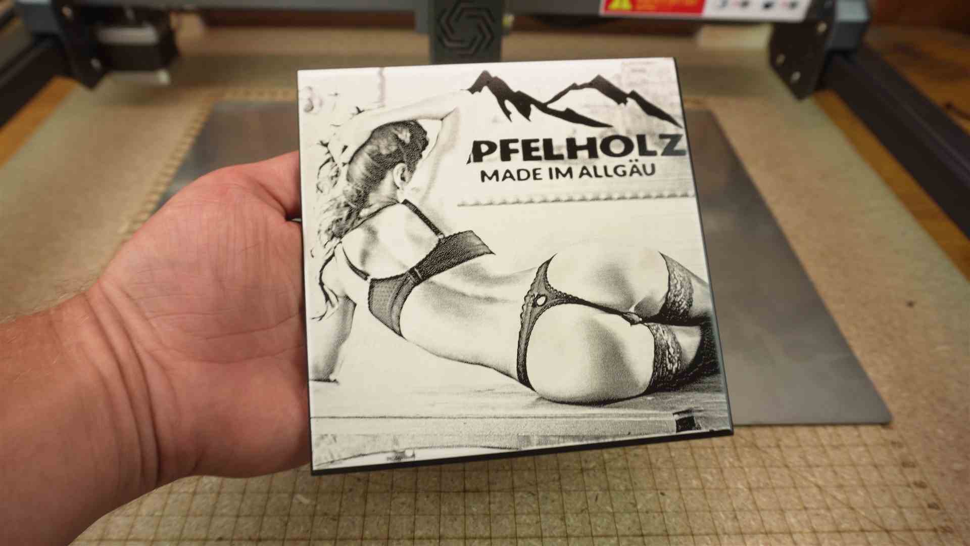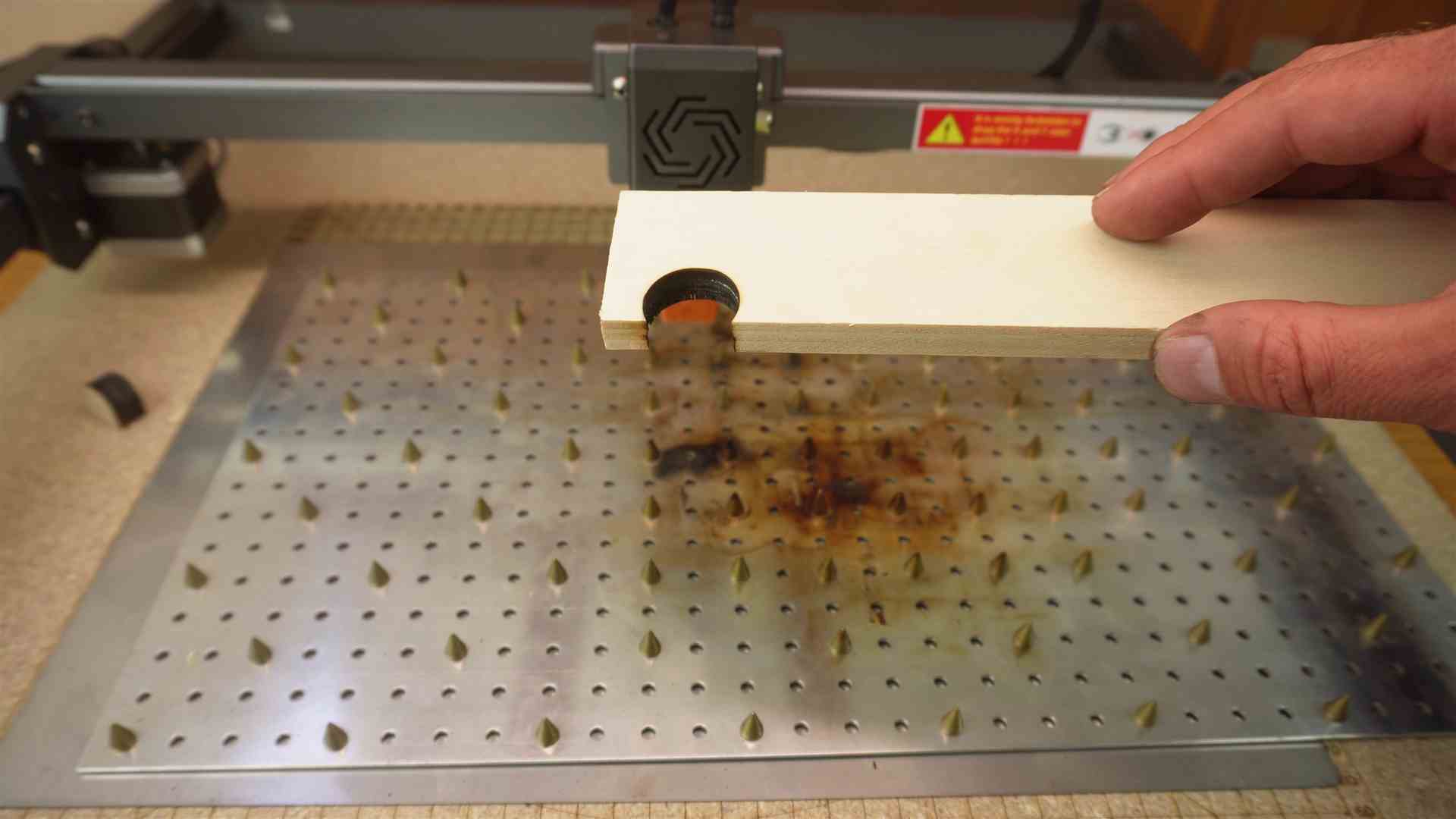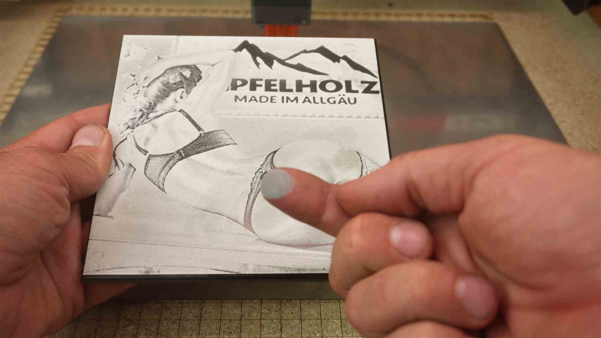 Solltet Ihr zu langsam lasern, kann es zum kokeln des Holzes anfangen. Durch den Air Assist kann es den Effekt noch verstärken. Das ist natürlich auch gefährlich, denn das Holz kann auch anfangen zu brennen. Deshalb bleibt immer am Laser.