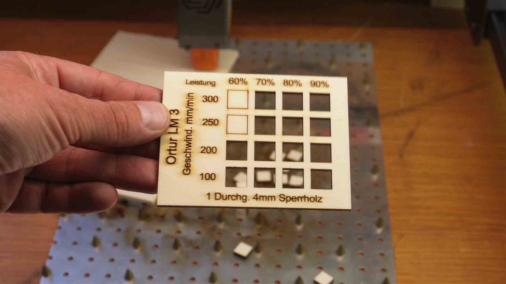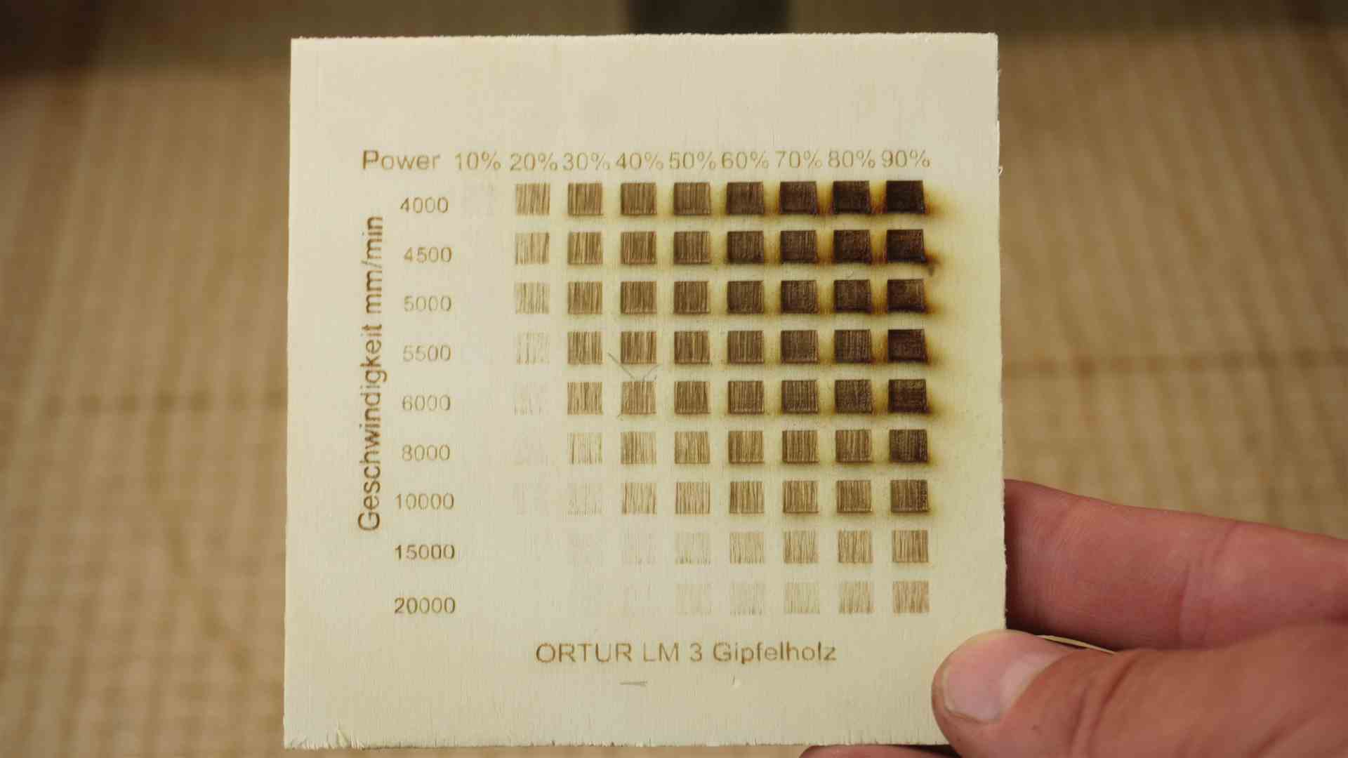 Lasern mit dem Ortur Laser Maser 3. Hier einige Beispiele mit Werten aus dem Video
