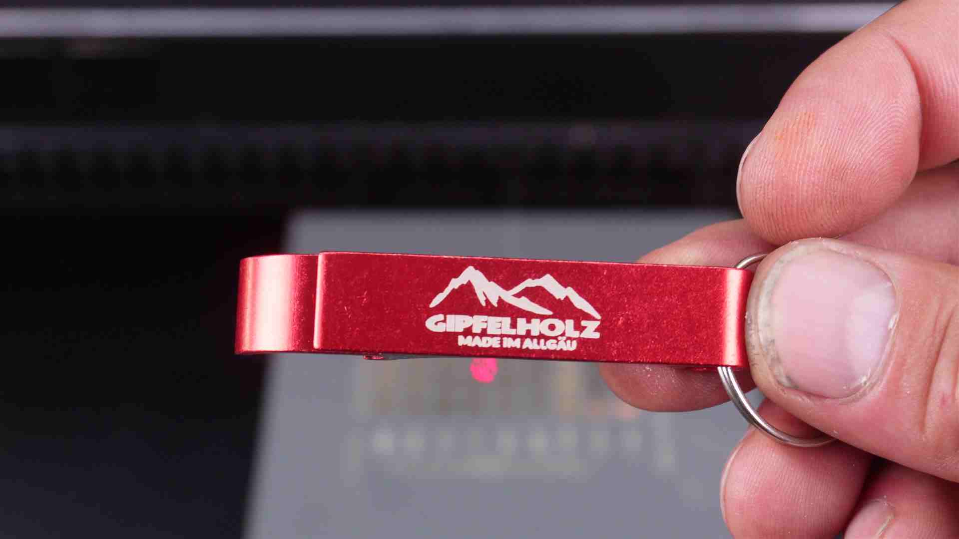 – Flaschenöffener Alu rot eloxiert – Speed 300 mm/sek – Leistung 25% – Linien/cm 200