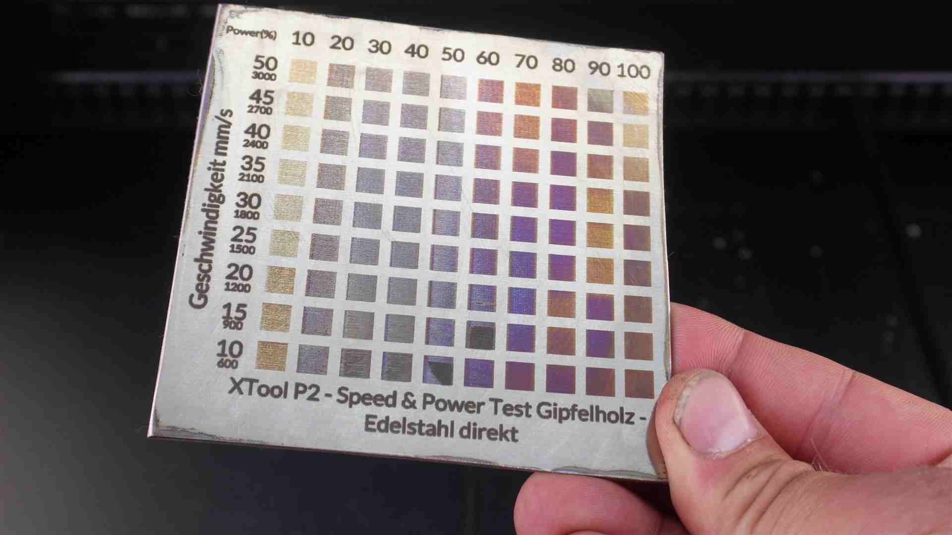 – Speed & Powertest Edelstahl – farbig lasern mit CO2 Laser – Speed 10-50 mm/sek – Leistung 10-100%