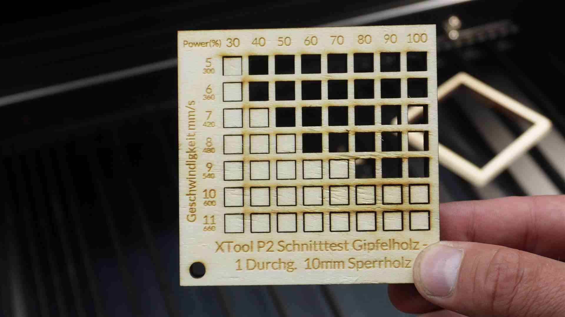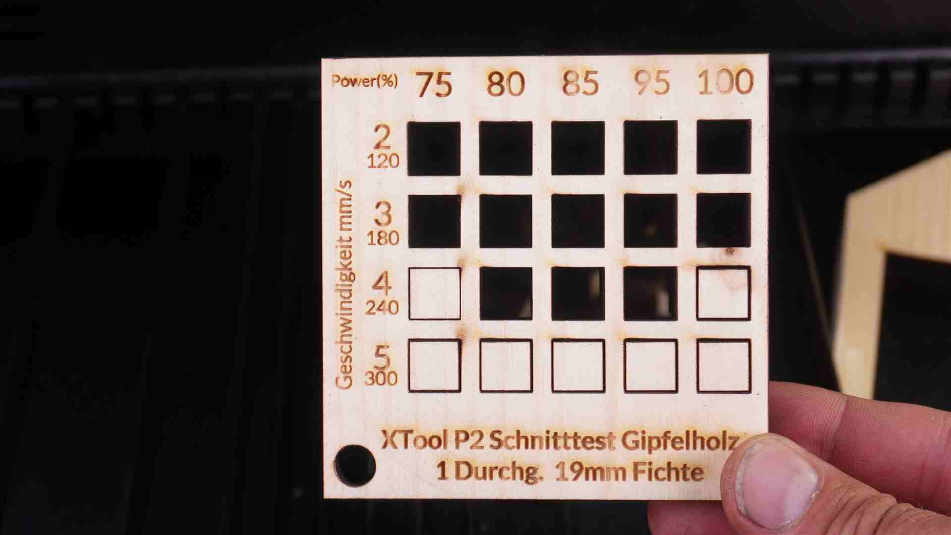 👉 **SPEED UND POWERTEST xTool P2 CO2 Laser von Gipfelholz – jeder Test kann in Creative Space individuell auf Eure Bedürftnisse angepasst werden – Achte bei dem Test darauf, die Materialstärke abzuändern.