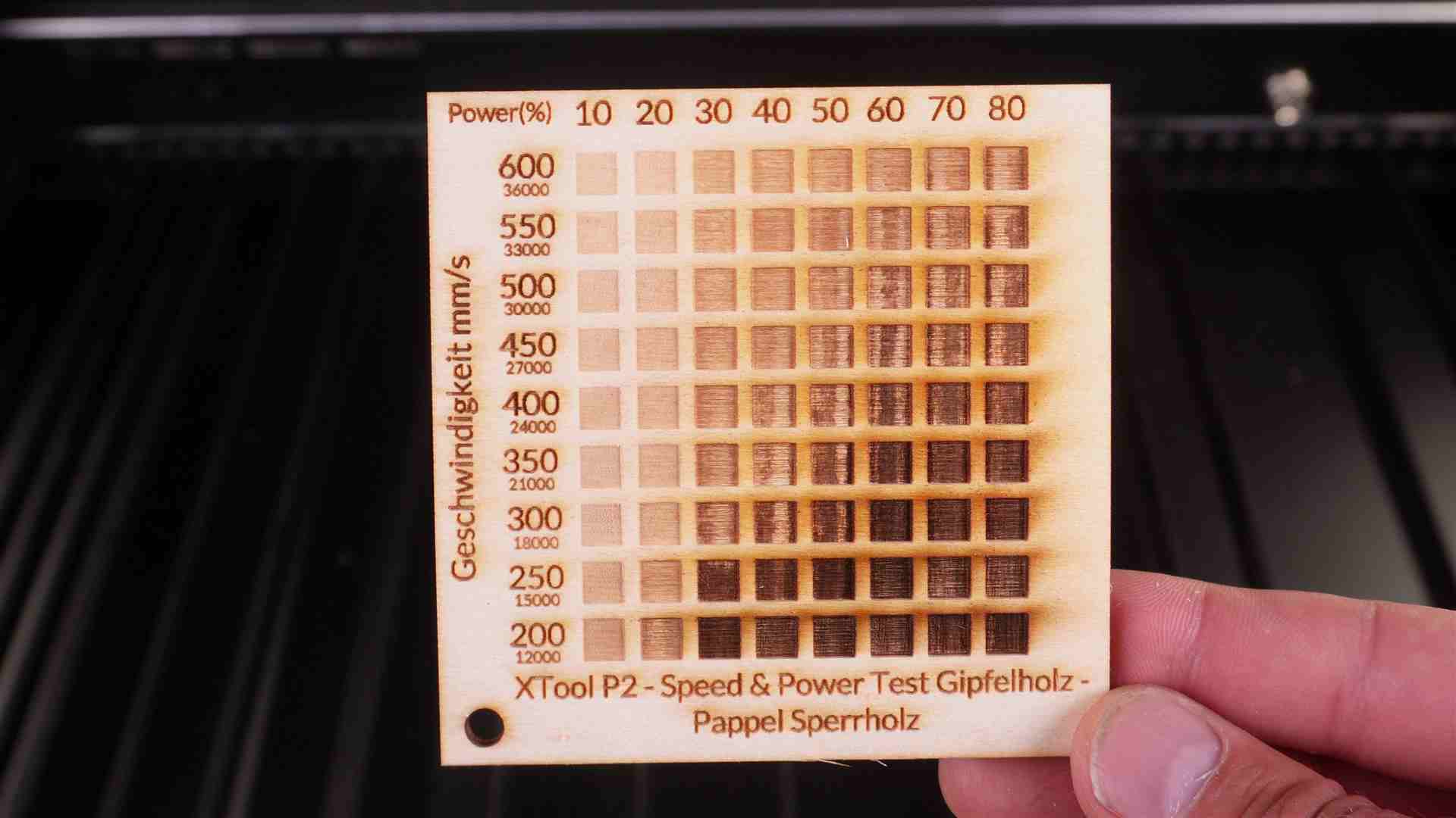 Achtung die angegebenen Werte gelten für den xTool P2 CO2 Laser mit 55 Watt.