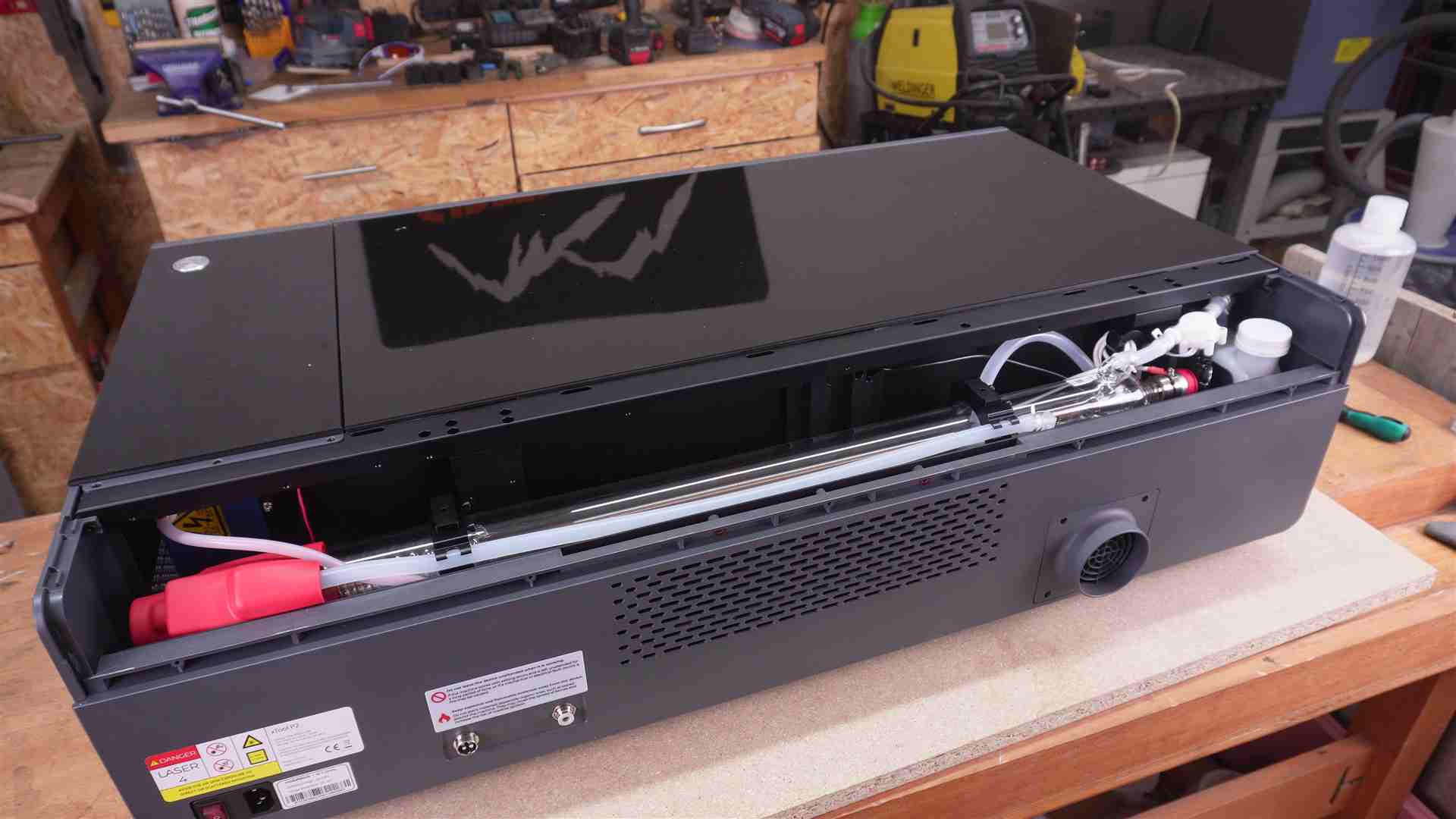 - Wasser auffüllen: Um die Laserröhre zu kühlen, benötigt ein CO2 Laser eine Wasserkühler. Bei vielen CO2 Lasern kann man eine Pumpe in ein Eimer Wasser legen oder einen externes Kühlgerät, auch Chiller genannt benutzen. Der xTool P2 hat die Wasserpumpe und den Wassertank schon im Gehäuse verbaut. Ob Frostschutz dem destiliertem Wasser beizumichen ist, kommt auf den Standort Eures Lasers darauf an. Sollte es im Winter in diesem Bereich zu Frost kommen, müsst Ihr Frostschutz beimischen. Benötige Füllmenge kann man der Bedienungsanleitung von xTool entnehmen.