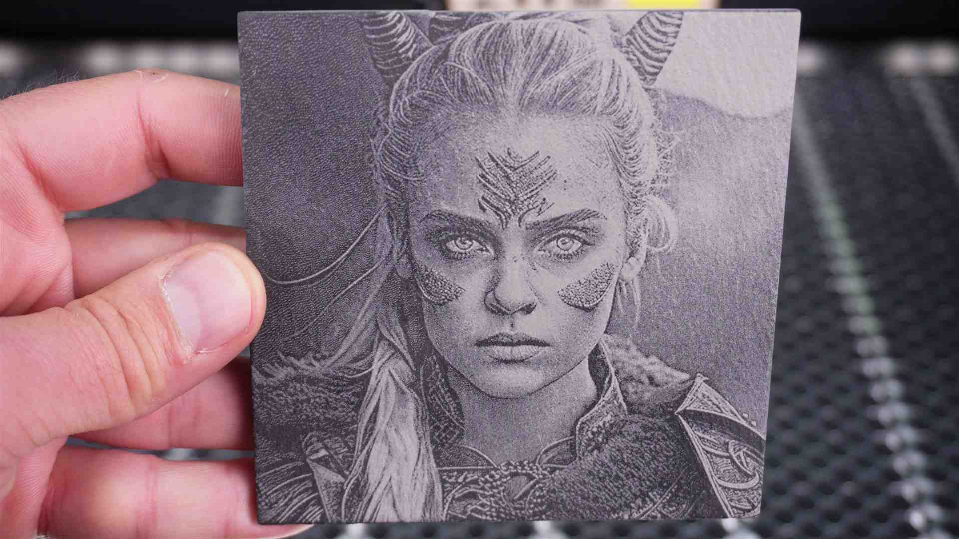 – Bild auf Schiefer – Speed 70 mm/sek – Leistung 60% – Linien/cm 260