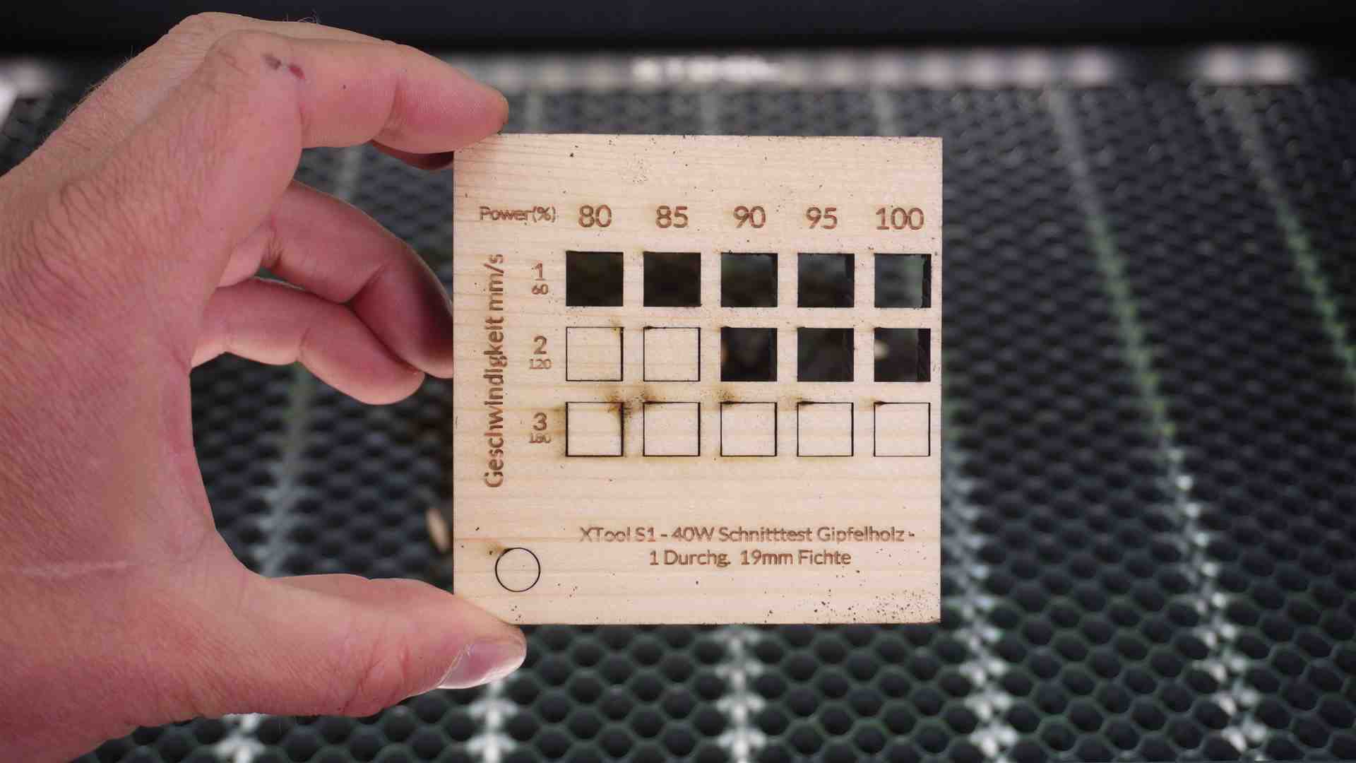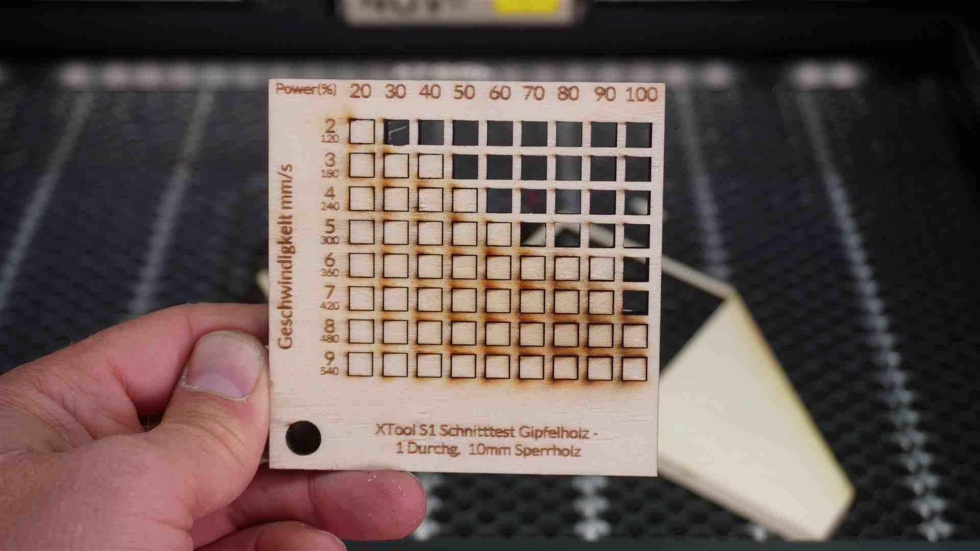 Den Powertest für den xTool S1 könnt Ihr unten downloaden. Dort empfehle ich Euch noch weiter Einstellungen vorzunehmen, um auf noch bessere Ergebnisse zu kommen.