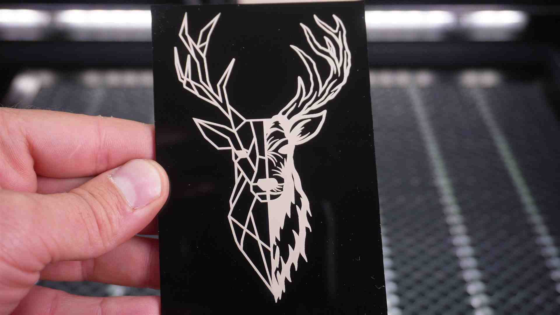 – Schwarzes Acryl Gravur – Speed 120 mm/sek – Leistung 60% – Linien/cm 200